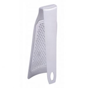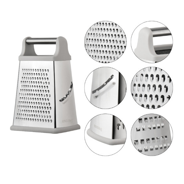 Kinghoff 4-pušu rīve, 21.7 × 15.5 × 12 cm, KH 1990. Izmēri: 21.7 × 15.5 × 12 cm. Izgatavota no augstas kvalitātes nerūsējošā tērauda. Četras darba virsmas dažādiem rīvēšanas veidiem. Ergonomisks, stabils rokturis ar tērauda elementu. Neslīdoša silikona pamatne papildu drošībai. Izturīga pret rūsu un viegli tīrāma.