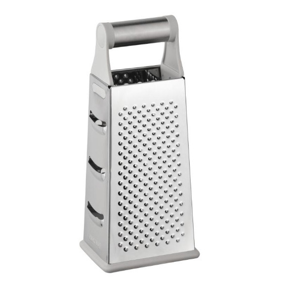 Kinghoff 4-pušu rīve, 24.8 × 10.8 × 8.5 cm, KH 1989. Izmēri: 24.8 × 10.8 × 8.5 cm. Izgatavota no augstas kvalitātes nerūsējošā tērauda, izturīga pret rūsu un bojājumiem. 4 dažādas rīves puses – rupjai rīvēšanai, smalkai rīvēšanai, griešanai un dārzeņu strēmelēm. Ergonomisks rokturis ar tērauda elementu stabilam satvērienam. Silikona neslīdoša pamatne nodrošina drošu lietošanu bez slīdēšanas. Gluda virsma ļauj viegli tīrīt un uzturēt higiēnu.