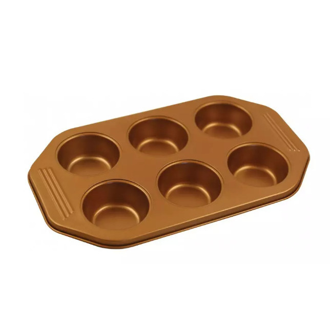 6 kēksu paplāte – zelta krāsā. ar nelīpošu pārklājumu. Maksimālā temperatūra 250 ° C; izmērs: 31×18,5x3cm.