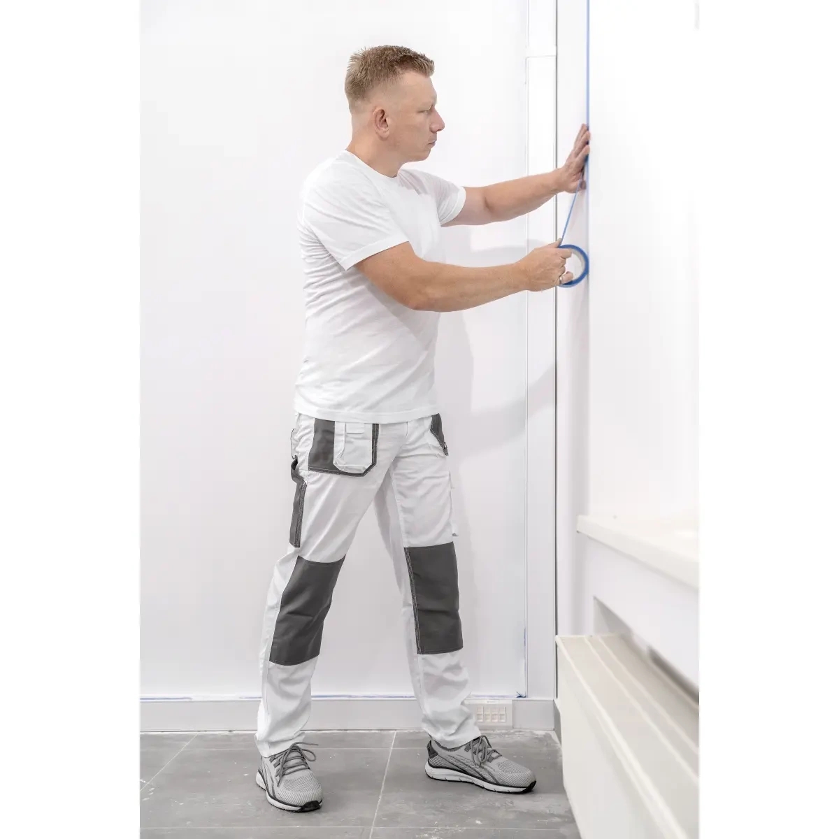 Baltā krāsa, 80 % poliesters, 20 % kokvilna, 190 g/m² džinss, pastiprinājumi uz ceļgaliem un kabatām, regulēšana viduklī ar pogām, trīskāršas šuves uz starām, 9 kabatas (tostarp 6 ar līplentes aizdari), cilpa āmuram, actiņa atslēgām