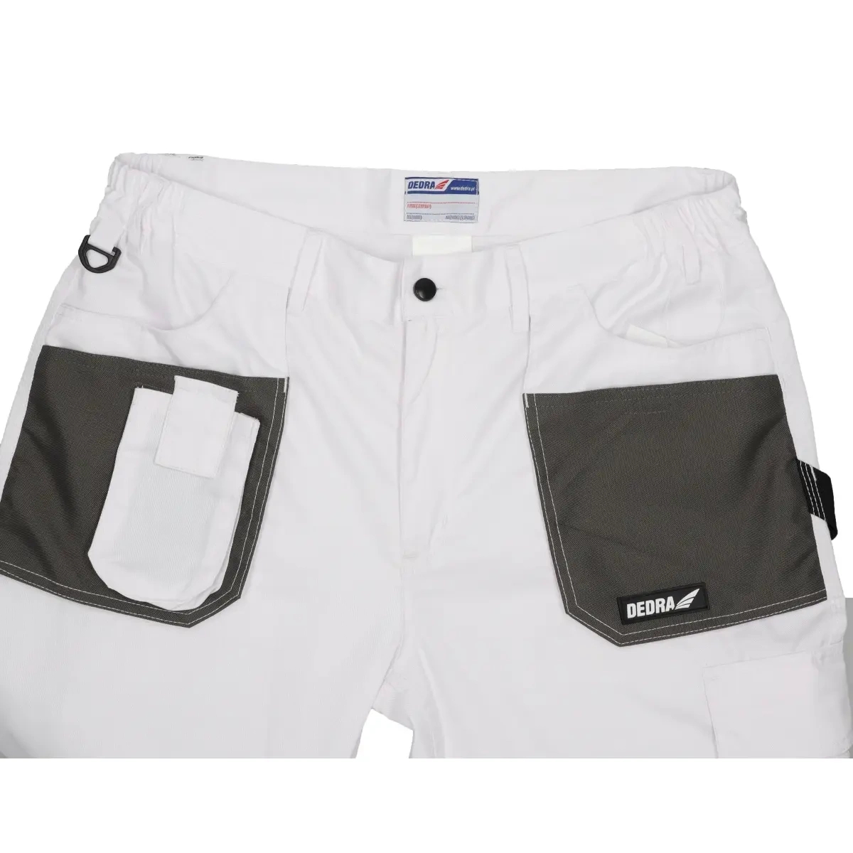 Baltā krāsa, 80 % poliesters, 20 % kokvilna, 190 g/m² džinss, pastiprinājumi uz ceļgaliem un kabatām, regulēšana viduklī ar pogām, trīskāršas šuves uz starām, 9 kabatas (tostarp 6 ar līplentes aizdari), cilpa āmuram, actiņa atslēgām