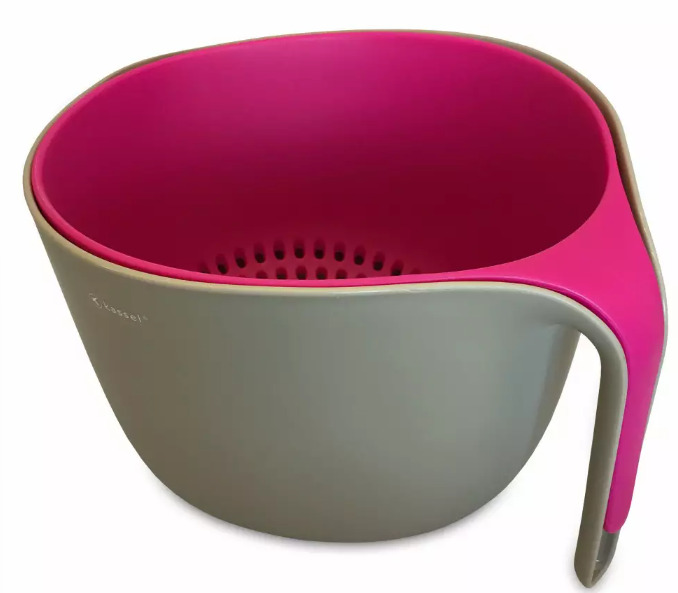 Bļoda un sietiņš, pelēka un rozā Kasele. Bļodā var sajaukt mīklu, salātus u.c. Caurduris nodrošina rūpīgu augļu, dārzeņu, salātu u.c. mazgāšanu. Materiāls: kvalitatīva plastmasa, izturīgs pret plīsumiem, drošs veselībai. Krāsa: pelēka – rozā. Tilpums: 4l. Izmēri: 23 x 18 cm.