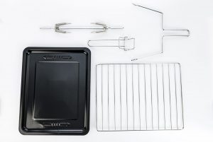 Nerūsējošā tērauda rokturis.Komplektā: cepšanas paplāte, cepšanas režģis, paplātes rokturis