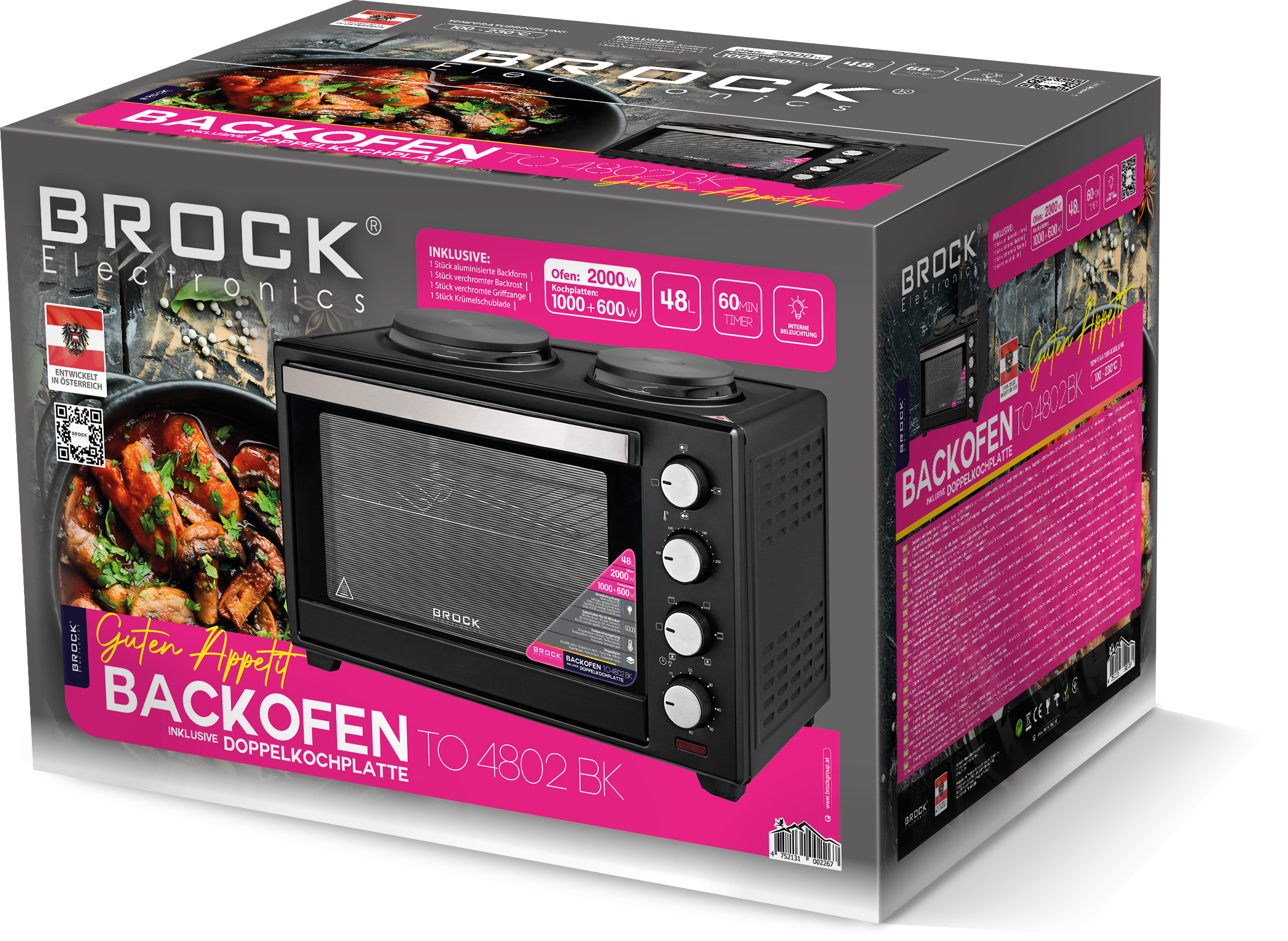 Cepeškrāsns ar sildvirsmām. Tilpums: 48L. Jauda: Krāsns: 2000W; Sildvirsmas: 1000W+600W. 4 slēdži. Iekšējais apgaismojums, dubultais stikls. Ar konvekciju. 220-240V,50/60Hz. Matēts melns vāks, matēts melns durvju rāmis, matēts melns durvju stiprinājums, s/s rokturis, ar VDE kontaktdakšu. Komplektā: cepšanas paplāte, cepšanas režģis, paplātes rokturis.