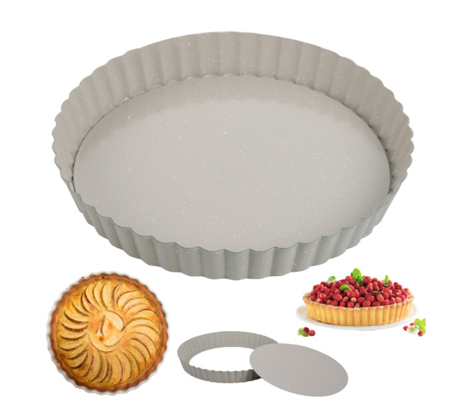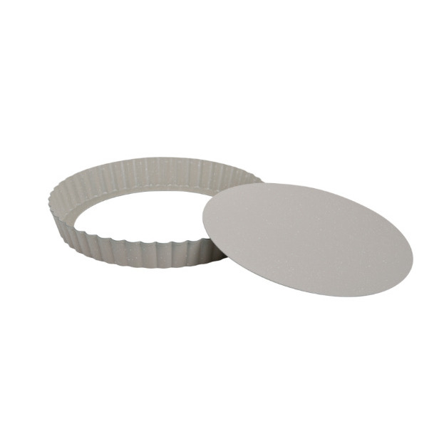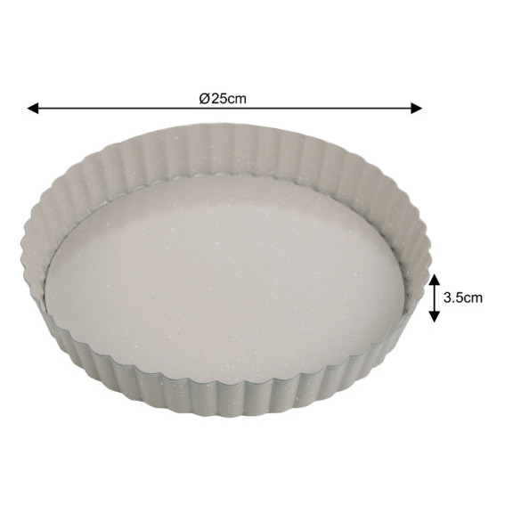 Cepšanas forma, Ø25 cm, KH 1969, KINGHoff. Aprīkota ar izņemamu pamatni ērtai un drošai tartes izņemšanai, nesabojājot pamatni. Nelīpošais marmora pārklājums prasa mazāk taukvielu, nodrošina vieglu tīrīšanu un novērš pielipšanu. Izgatavota no oglekļa tērauda ar izcilu siltumvadītspēju un vienmērīgu cepšanu. Karstumizturīga līdz 220°C, droša standarta cepšanas apstākļiem. 3.5 cm augstā rievotā mala piešķir kūkām elegantu, viļņotu formu. Diametrs 25 cm – praktisks ģimenes izmērs, lieliski piemērots tartēm un kišiem.