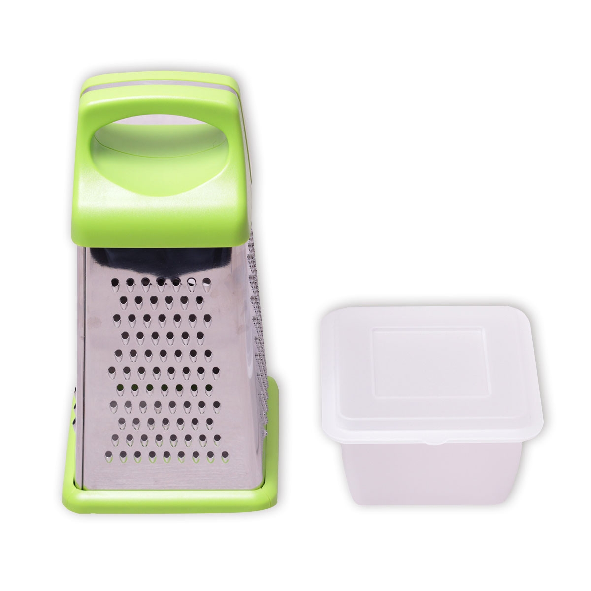 Četrpusīga nerūsējošā tērauda rīve ar trauku, 7202, Kamille. Rīve izgatavota no nerūsējošā tērauda ar plastmasas rokturi un silikona pamatni. Tai ir 4 asmeņu tipi un aizverams trauks. Augstums: 21cm. Pamatne: 10.5×10.5cm. Ērta un viegli lietojama. Ieteicama roku mazgāšana.