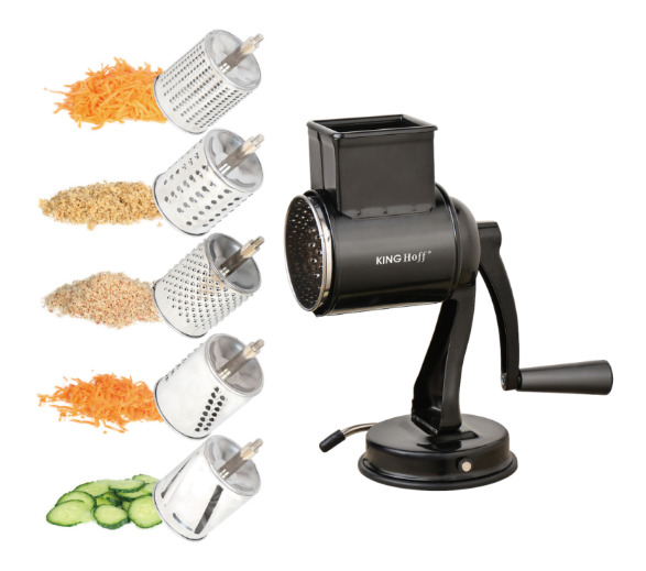 Cilindru rīve, ar 5 maināmām kasetnēm, melna, KINGHoff, KH 1951. Izgatavota no augstas kvalitātes nerūsējošā tērauda un ABS plastmasas elegantā melnā krāsā. Komplektā 5 maināmas 430SS nerūsējošā tērauda kasetnes dažādiem pielietojumiem. Stabila pamatne ar piesūcekni drošai nostiprināšanai uz darba virsmas. Manuāla darbība ar ērtu kloķa rokturi – nav nepieciešama elektrība vai baterijas. Viegli tīrāma un kompakta uzglabāšanai. Izmēri: augstums 22.3 cm, pamatnes platums 10.8 cm.