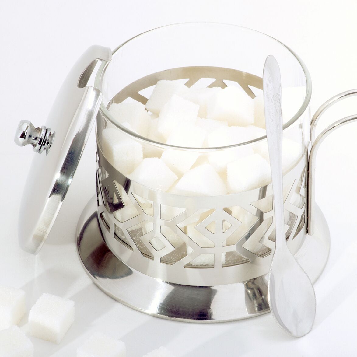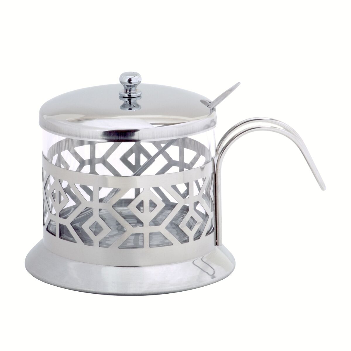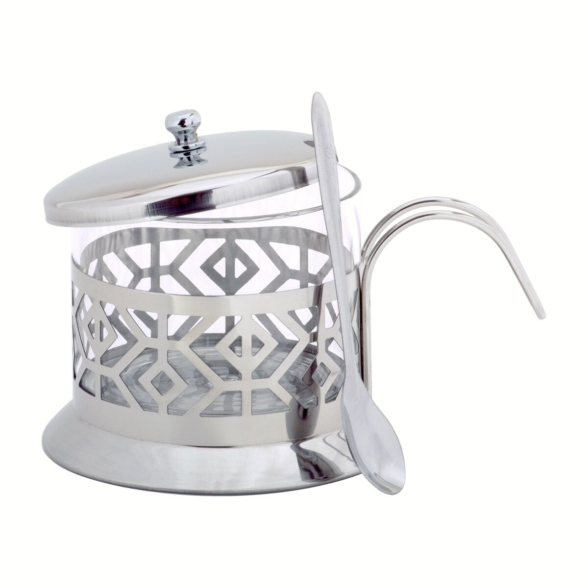 Cukurtrauks 200ml ar karotīti, 7007, Kamille. Izgatavots no stikla un augstas kvalitātes spīdīgi pulēta tērauda. Komplektā ietilpst karotīte un vāciņš ar rokturi. Tilpums: 200ml. Ērts un viegli lietojams. Praktisks un noderīgs katrā mājā.