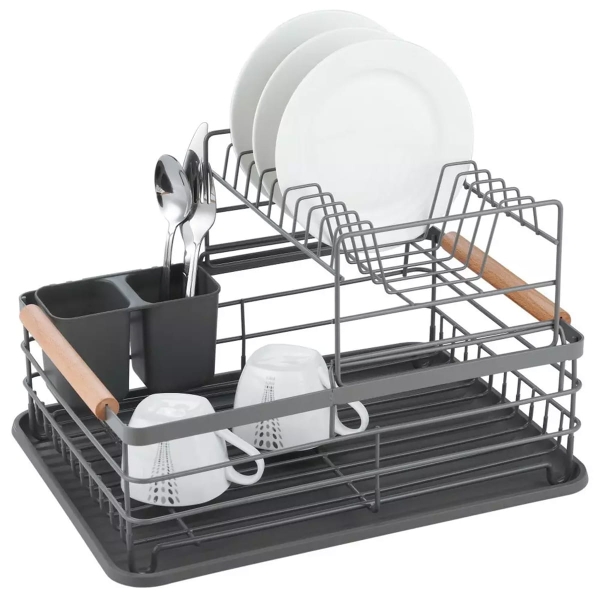 Divstāvu trauku žāvēšanas statīvs, tērauds-plastmasa-koks, pelēks – KINGHoff. Kvalitatīvs, pulverkrāsots metāla rāmis. Izturīga metāla konstrukcija. Mazgāt tikai ar rokām, nosusināt uzreiz pēc mazgāšanas. Noņemama plastmasas trauku drenāža. Izmēri: 43x32x27 cm.
