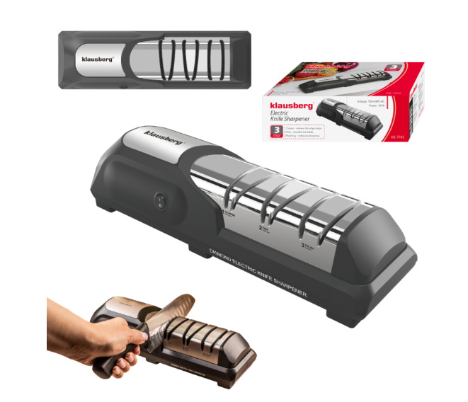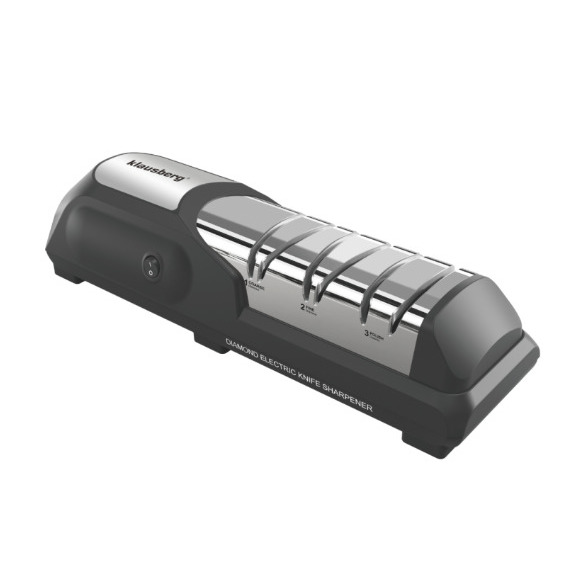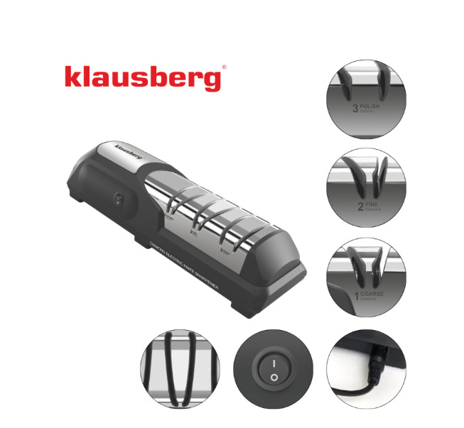 Elektriskais dimanta nažu asinātājs, 28 × 8.5 × 6.6 cm, KB 7945, Klausberg. Aprīkots ar dimanta un keramikas asināšanas diskiem augstākai precizitātei un izturībai. Leņķa vadotnes nodrošina ideālu naža novietojumu. Piemērots taisniem un zobainiem nažiem, tostarp virtuves, saimniecības, sporta un kabatas nažiem. Ļoti viegli lietojams, nav nepieciešamas īpašas prasmes. Izgatavots no ABS, silikona un nerūsējošā tērauda. Spriegums: 100–240 V AC. Jauda: 18 W. Izmēri: 28 × 8.5 × 6.6 cm. Krāsa: melna un sudraba.