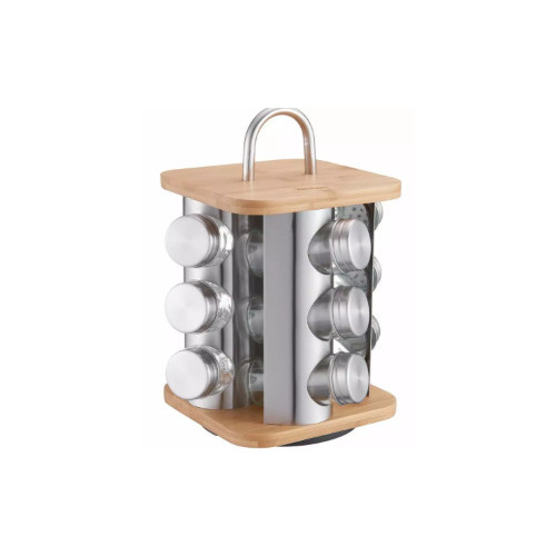 Klausberg garšvielu burciņu komplekts, tērauds, stikls un bambuss, 13 daļas, KB 7554. Stikla trauki ar tērauda vāku: – 16 gab. Rotējošs bambusa statīvs: – 1 gab. Uzlīmes ar garšvielu nosaukumiem – 16 gab.