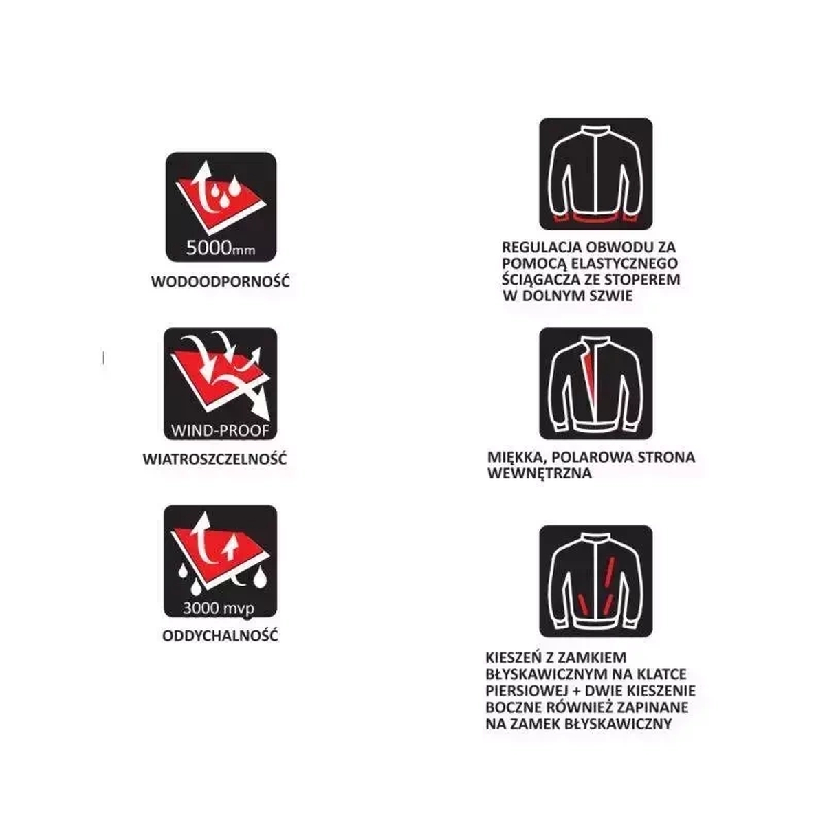 Materiāls: 96 % poliestera/4 % elastāna; svars 320 gsm; ūdensizturība: 5000 mm; elpojamība: 3000 mm; vēja necaurlaidīgs; savelkama aukla ar aizbāžņiem apakšējā šuvē; 3 ietilpīgas kabatas ar rāvējslēdzēju.