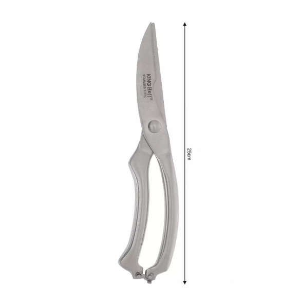 Mājsaimniecības šķēres, KH 3458, Kinghoff. Augstas kvalitātes nerūsējošā tērauda asmeņi. Ļoti ilgs kalpošanas laiks. Paredzētas visu veidu mājputnu griešanai. Asmens droši notur kaulus griešanas laikā. Āķis drošai uzglabāšanai.