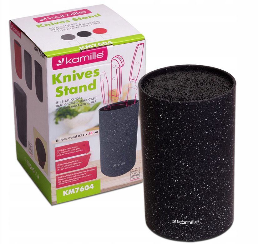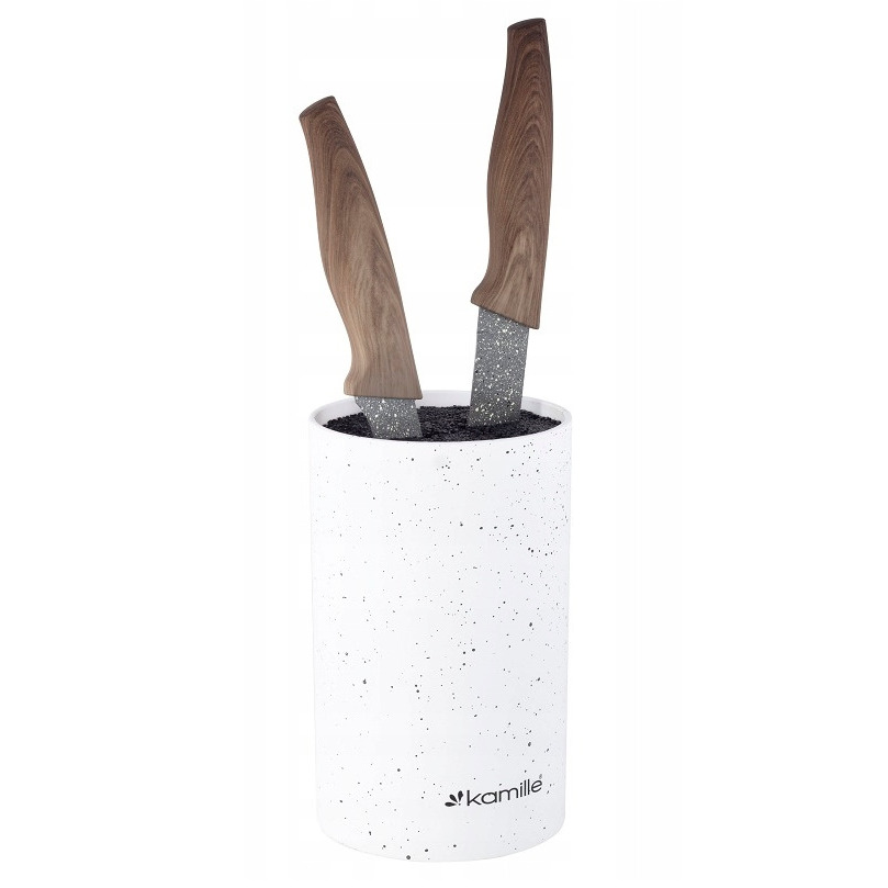 Nažu statīvs 11×18cm, marmora dizains, 7604, Kamille. Izgatavots no augstas kvalitātes plastmasas ar “soft-touch” pārklājumu. Pildījums sastāv no izņemamiem plastmasas stieņiem. Diametrs: 11cm. Augstums: 18cm. Pieejams 3 krāsās: melnā, baltā un pelēkā.