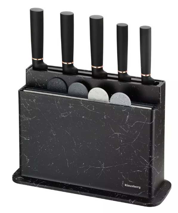 Nažu un griešanas dēļu komplekts, marmora melnā un pelēkā krāsā, Klausberg. Komplektā 5 nažu gabali no augstas kvalitātes nerūsējošā tērauda asmeņiem un 4 griešanas dēļu gabali no augstas kvalitātes drošas plastmasas. 5 nažu komplekts: 8cal – šefpavāra nazis, 8cal – griešanas nazis, 8cal – maizes nazis, 5cal – universāls nazis, 3,5cal – mizošanas nazis. 4 plastmasas griešanas dēļu gabali. Viegli identificēt, viegli uzglabāt.
