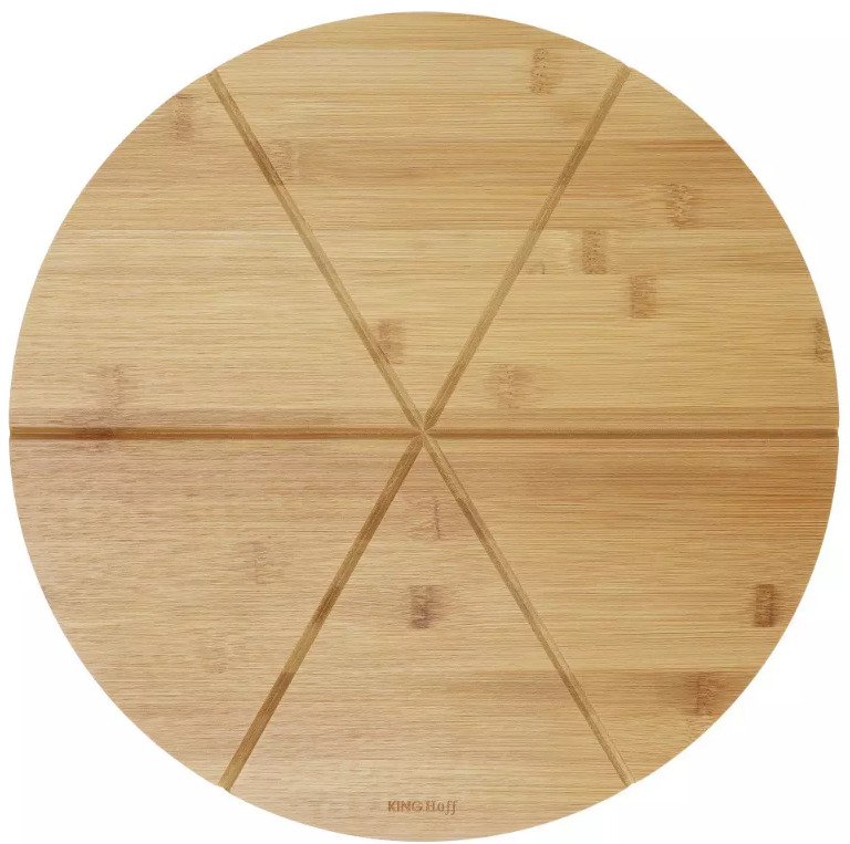 Picas šķīvis, bambuss, Ø35cm KINGHoff. Dabiskā bambusa krāsa. Viegla griešana: Izgatavots no stingra bambusa ar 6 daļām vienāda izmēra picas šķēlītēm. Šķīvja diametrs ir aptuveni 35 cm, tas ir pietiekami liels picas, gaļas, augļu, dārzeņu un citu ēdienu sagriešanai un pasniegšanai. Ciets un izturīgs, nodilumizturīgs. Viegli mazgājams, mazgājams tikai ar rokām. Izmērs: 35 x 35 x 1,5 cm.