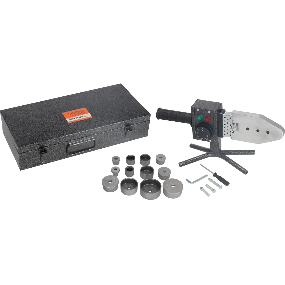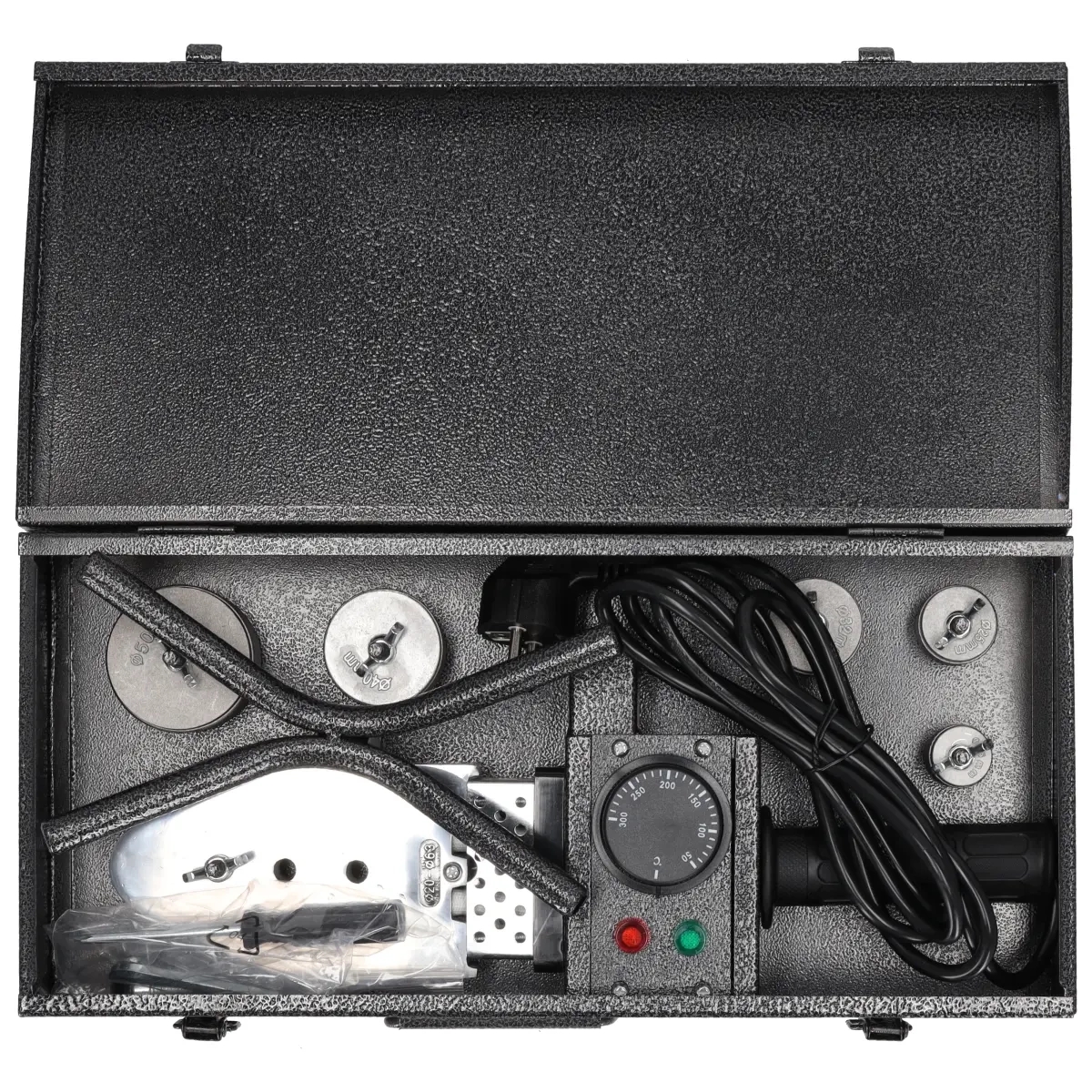 Maksimālā kausēšanas temperatūra 300 °C, uzgaļu komplekts: 16, 20, 25, 32, 40–55 mm, koferis