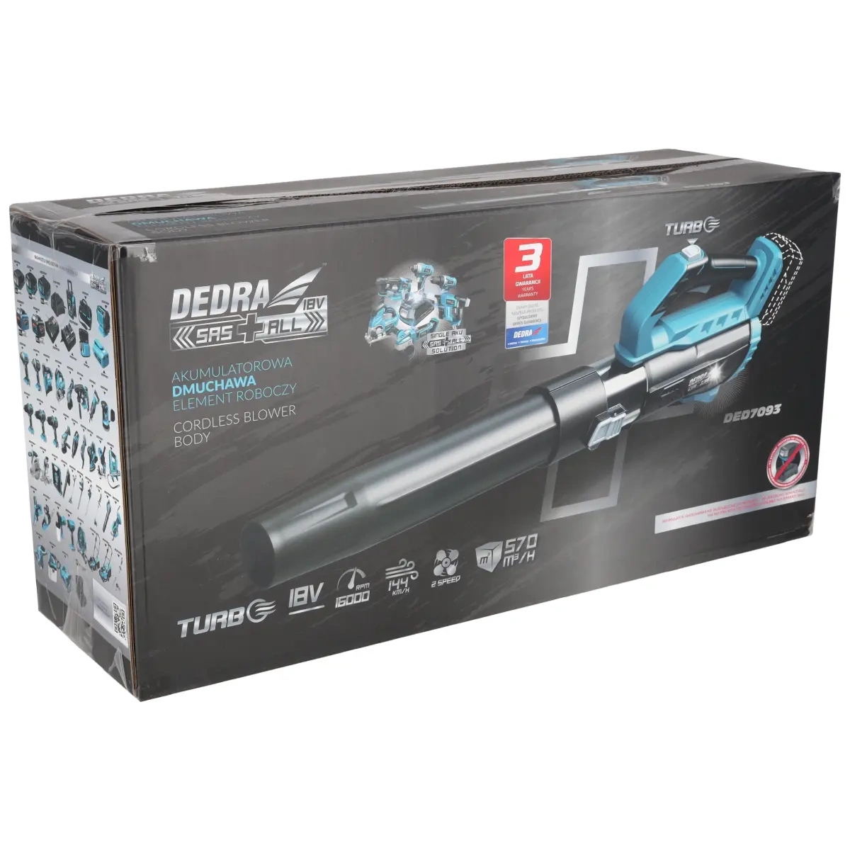 Divpakāpju rotācijas ātruma kontrole, ātrums TURBO režīmā – 16000min-1, gaisa ātrums 144km/h, gaisa plūsma 570m3/h
