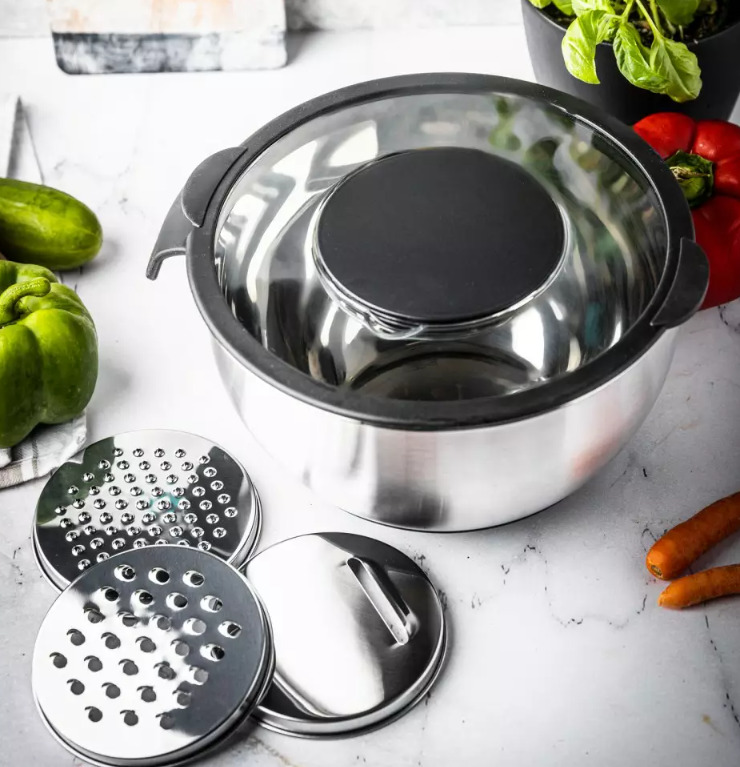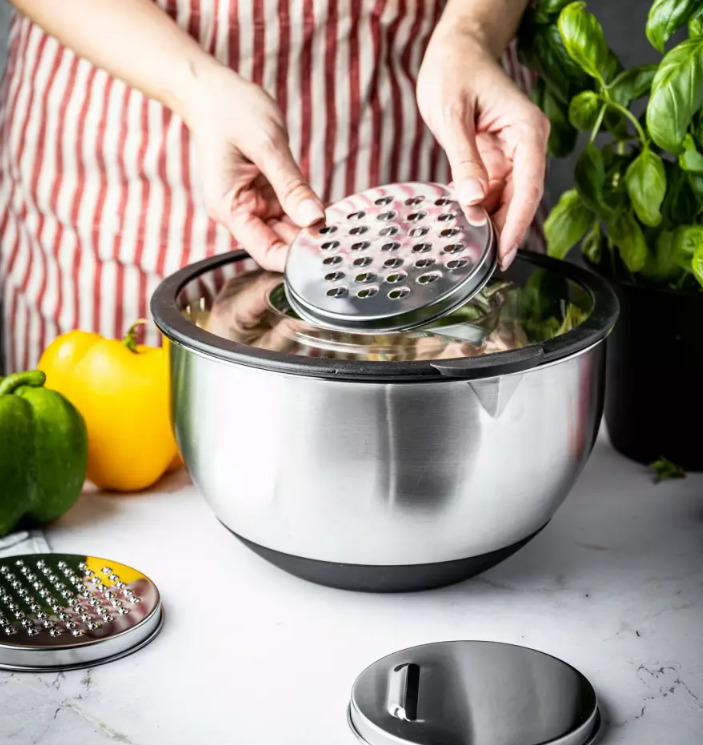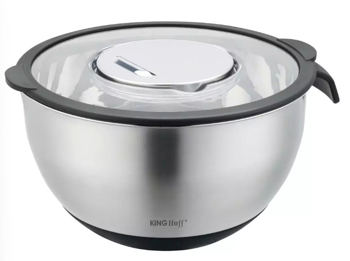 Tērauda bļoda ar vāku, daudzfunkcionāla, menla, tilpums 5l , KINGHoff. Augstas kvalitātes nerūsējošais tērauds. Plaši neslīdoši silikona apmales bļodas apakšā. Vāks ar atveri pildīšanai, jaukšanai ar rokām vai ar dažu elektrisko mikseru lāpstiņu. Ar skalu/gradāciju šķidru vai nebirstomu produktu mērīšanai. Viegli tīrāms. Bļodas izmēri: Ø 24 cm x A 14 cm.