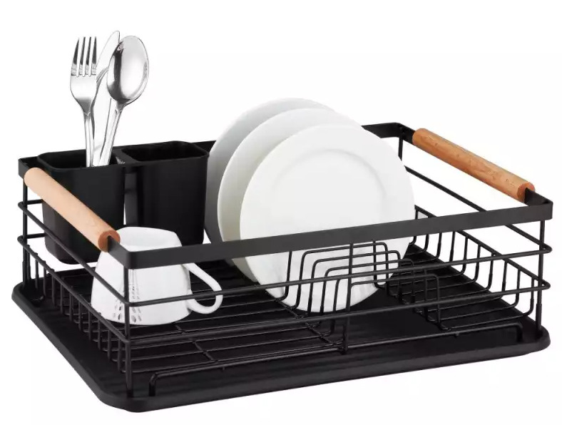 Trauku žāvēšanas statīvs, tērauds, melns, 42,5x32x15,5 cm, Kinghoff. Augstas kvalitātes pulverkrāsots metāla rāmis. Krāsaina stiepļu pamatne ar mīkstu pārklājumu, lai aizsargātu jūsu traukus. Izturīga metāla konstrukcija. Trauku nosusinātājam abās pusēs ir ērti koka pārnēsāšanas rokturi, kuros var pakārt virtuves lupatiņu. Neliela drenāža ar rievām, lai ievietotu maksimālo plākšņu skaitu. Apakšā esošā paplāte neļauj virtuvei kļūt mitrai. Mazgāt tikai ar rokām, nosusināt uzreiz pēc mazgāšanas. Noņemama plastmasas galda piederumu drenāža. Melna krāsa. Izmērs: 42,5x32x15,5 cm.