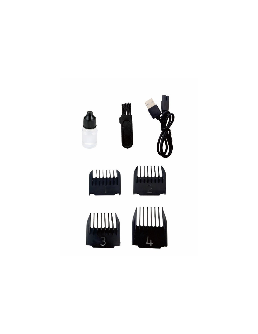 Matu griešanas mašīna. Uzlādējams ar USB. Darba indikators. Komplektā iekļautie piederumi: 4 ķemmes ar garuma ierobežojumu (3, 6, 9, 12 mm); Tīrīšanas birste; Mašīnītes eļļa; Uzlādes kabelis. Griešanas asmens ar piecu līmeņu regulēšanu. Keramikas asmens. Uzlādes laiks: 3 stundas. Lietošanas laiks: 90 minūtes. Uzlādes spriegums: DC 5V. Nominālā jauda: DC 3.7V 800mA, 5W.