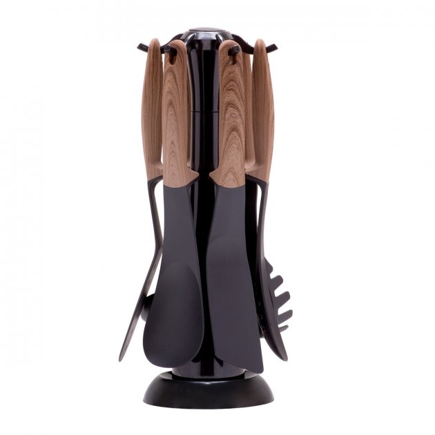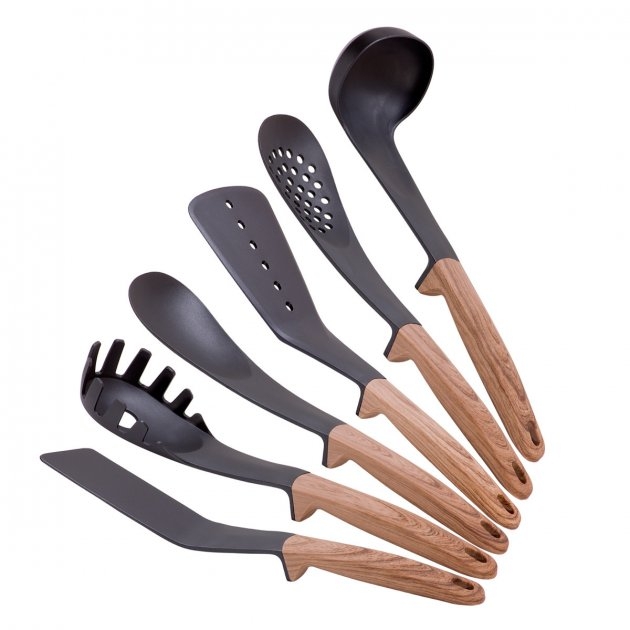 Virtuves piederumu komplekts, 7 gab., 5235, Kamille. Komplekts sastāv no 7 daļām: kauss, caurduršā karote, karote vārīšanai, karote makaroniem, lāpstiņa, lāpstiņa ar atverēm un statīvs. Materiāls: neilons. Var izmantot traukos ar jebkuru pārklājumu.