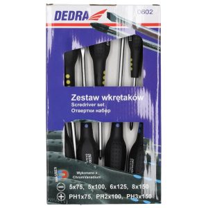 Materiāls: CrV tērauds (PP rokturis); magnētiskie uzgaļi; komplekts: SL7x75/SL5x100/SL6x125/SL8x150/PH1x75/PH2x100/PH3x150 Izolācija Nav Magnētiskais gals JĀ Materiāls CrV Tips Skrūvgriežu komplekts sērija DEDRA Uzgaļa veids SL5, SL6, SL7, SL8, PH1, PH2, PH3 Numurs ir iekļauts 7